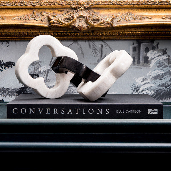 Chain link in the shape of quatrefoils made from white and black stone. Use it on top of a pile of books or as a desk accent.