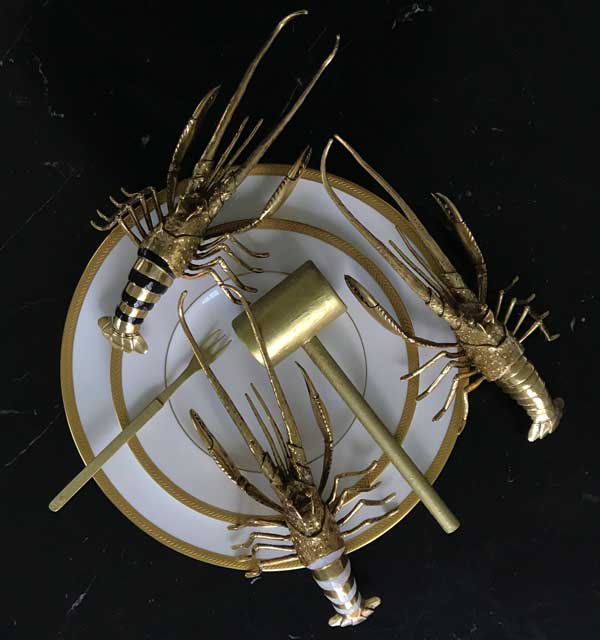 Our latest paperweights and objets. A trio of lobsters in cast brass and shell inlay. Choose from black pen shell or mother of pearl, or if you are a purist in all brass. Gorgeous surrealistic sculptures for your desk.